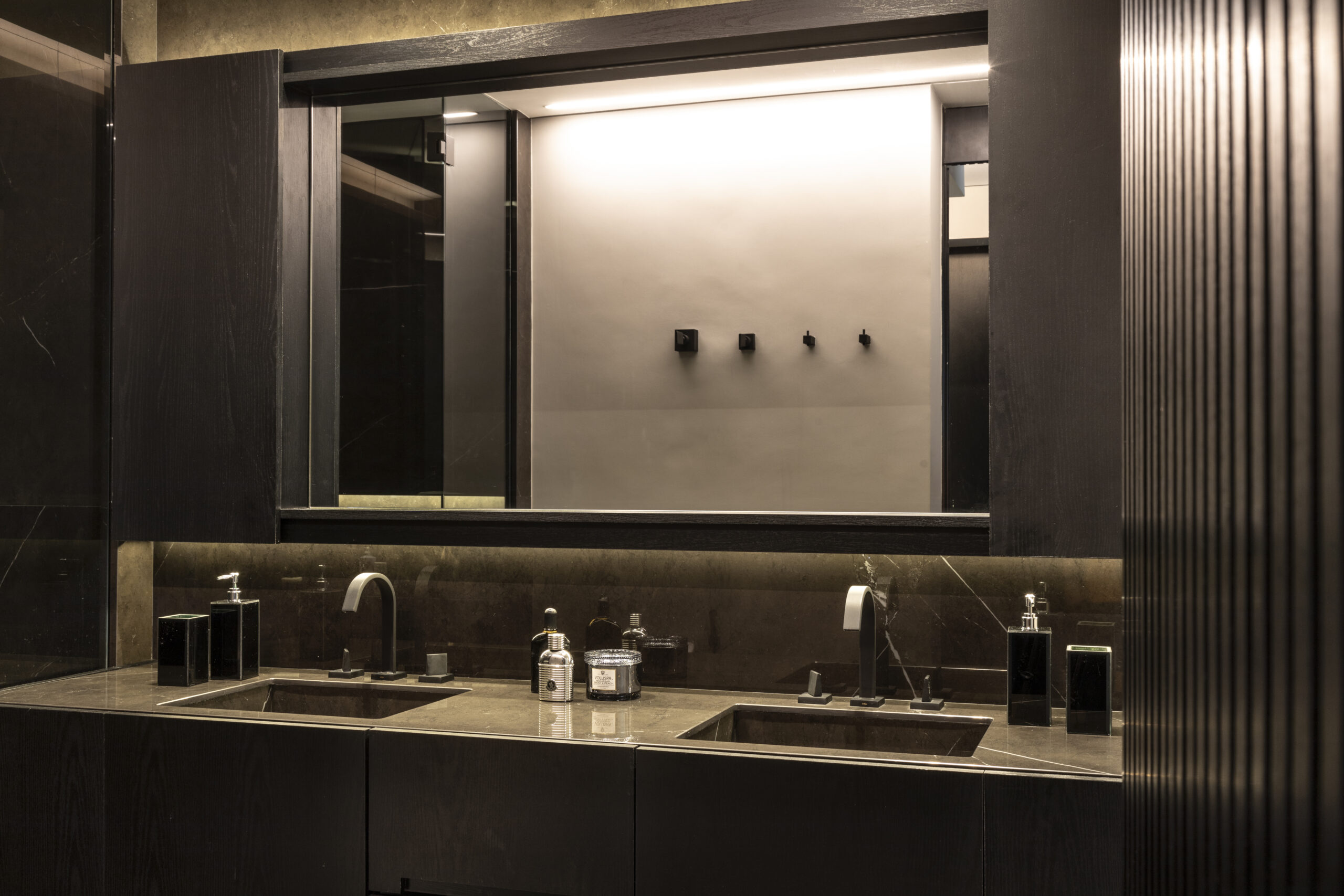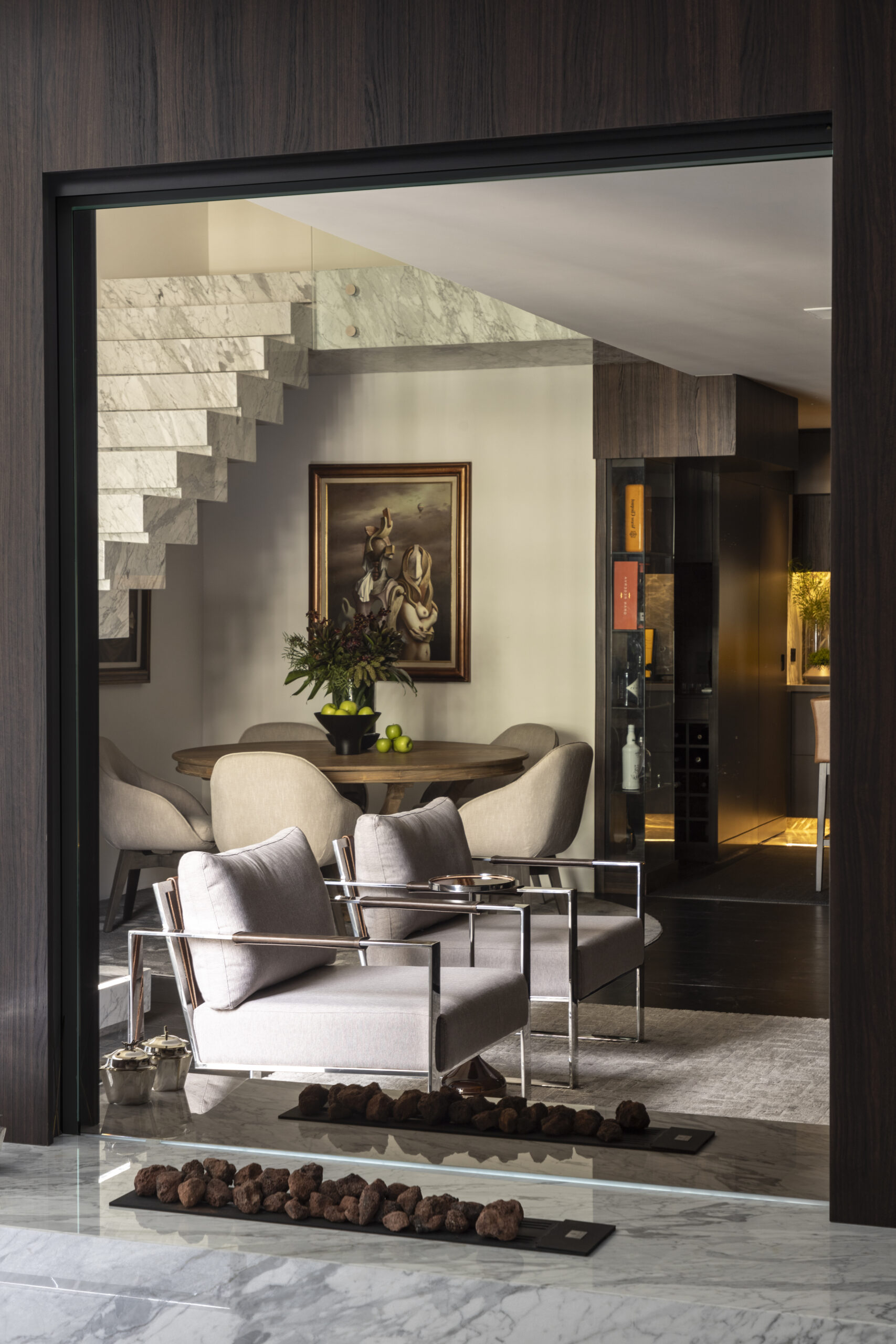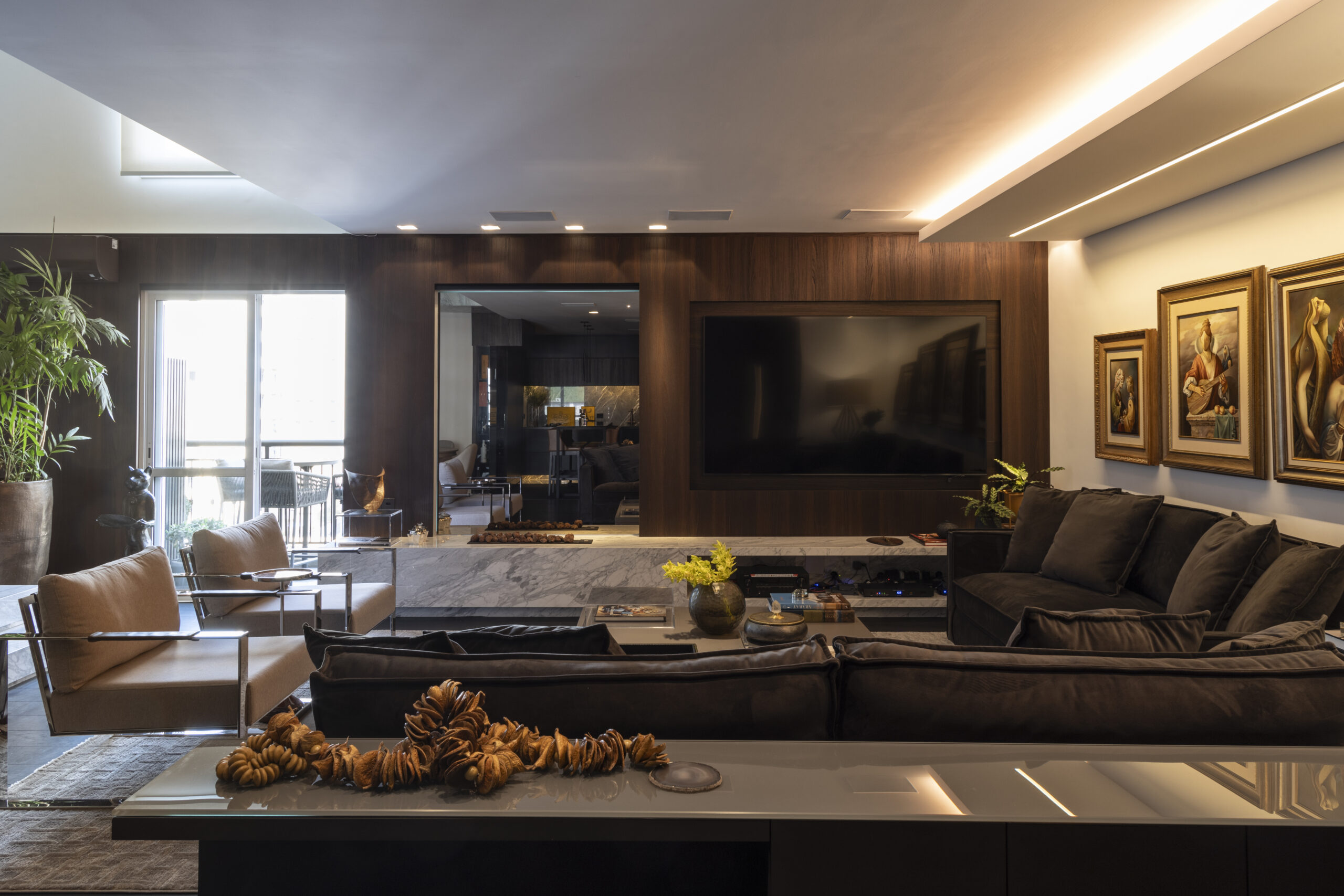 Todo o projeto nasceu da paixão do morador pelos quadros de Vito Campanella, artista italiano. A coleção de arte foi o ponto de partida para definir a paleta de cores, texturas e até o clima do apartamento de 170 m², pensado como uma moldura para valorizar cada obra. Com atmosfera masculina e sofisticada, ele também reflete o prazer de receber bem, unindo arte, personalidade e funcionalidade em cada detalhe, como o espaço de bar sob medida.