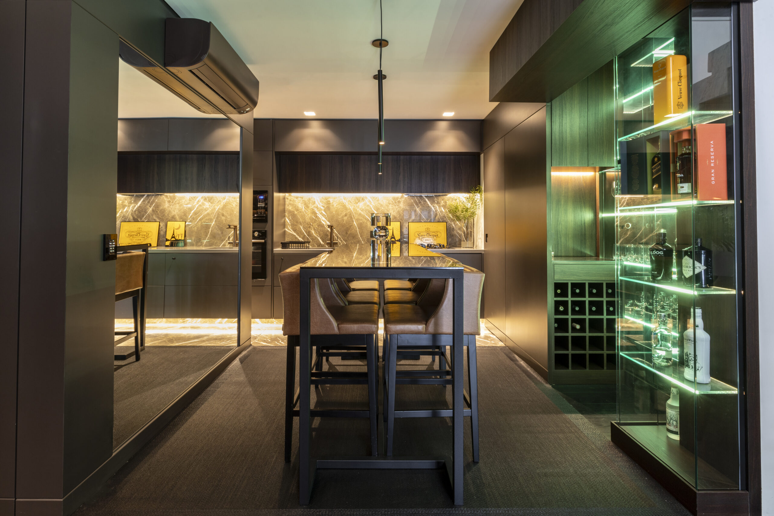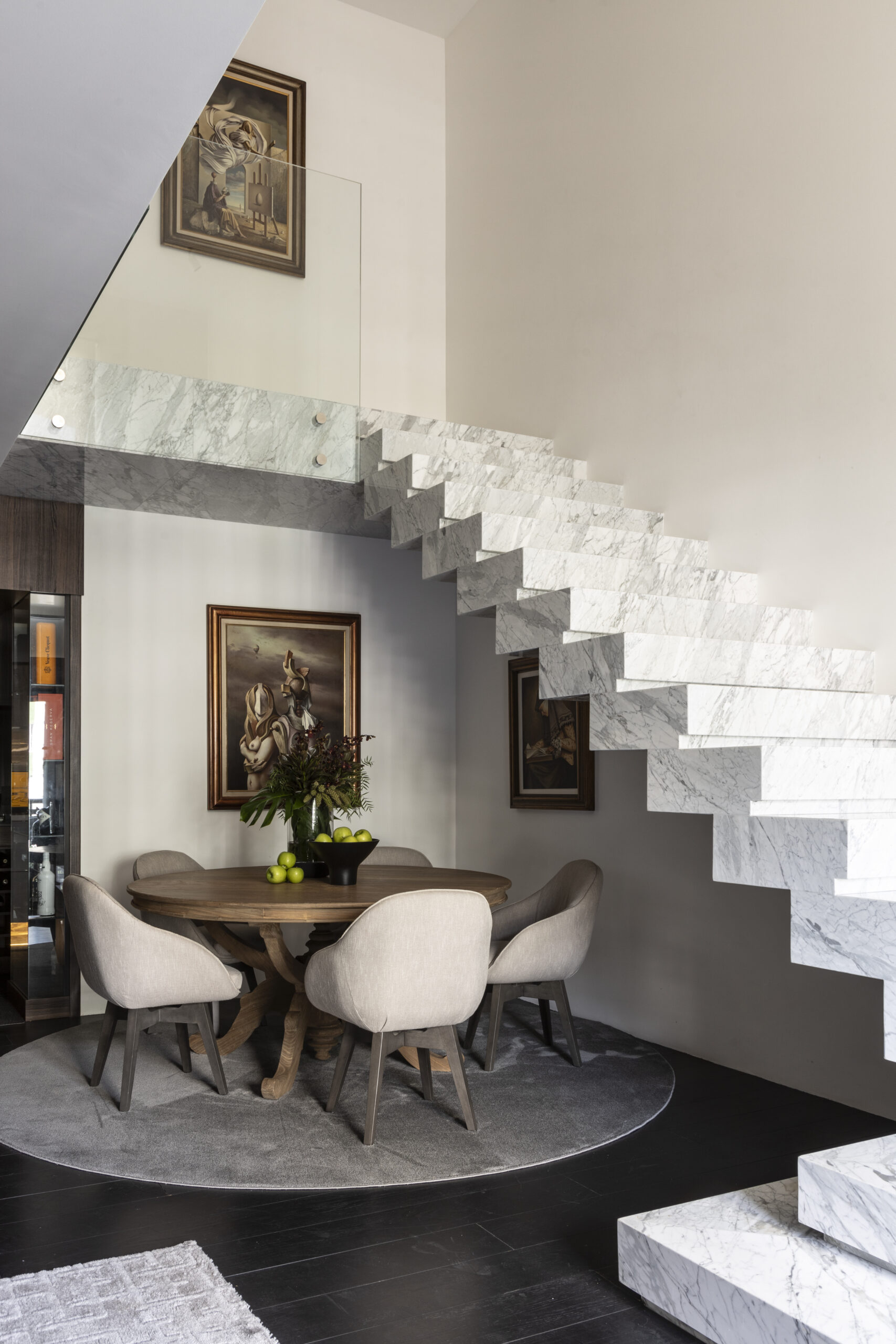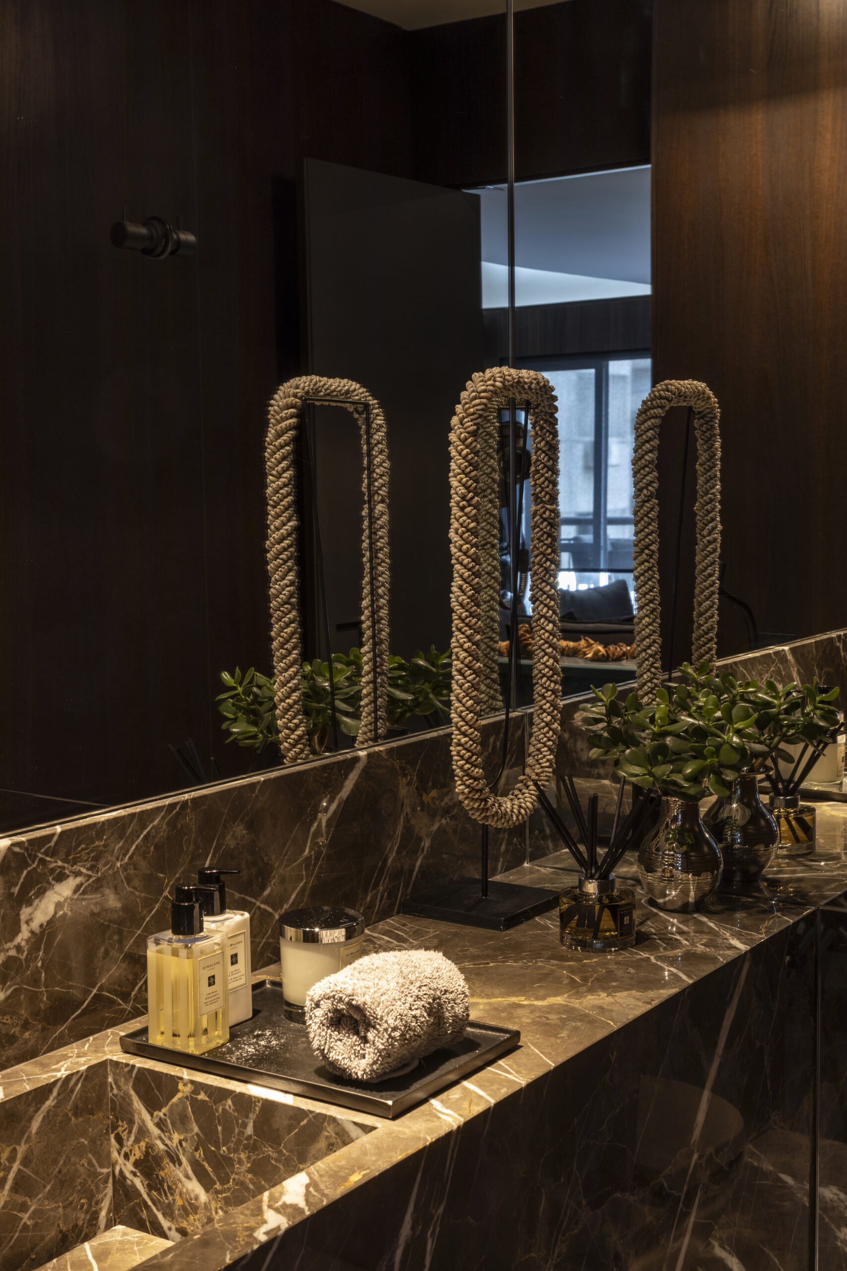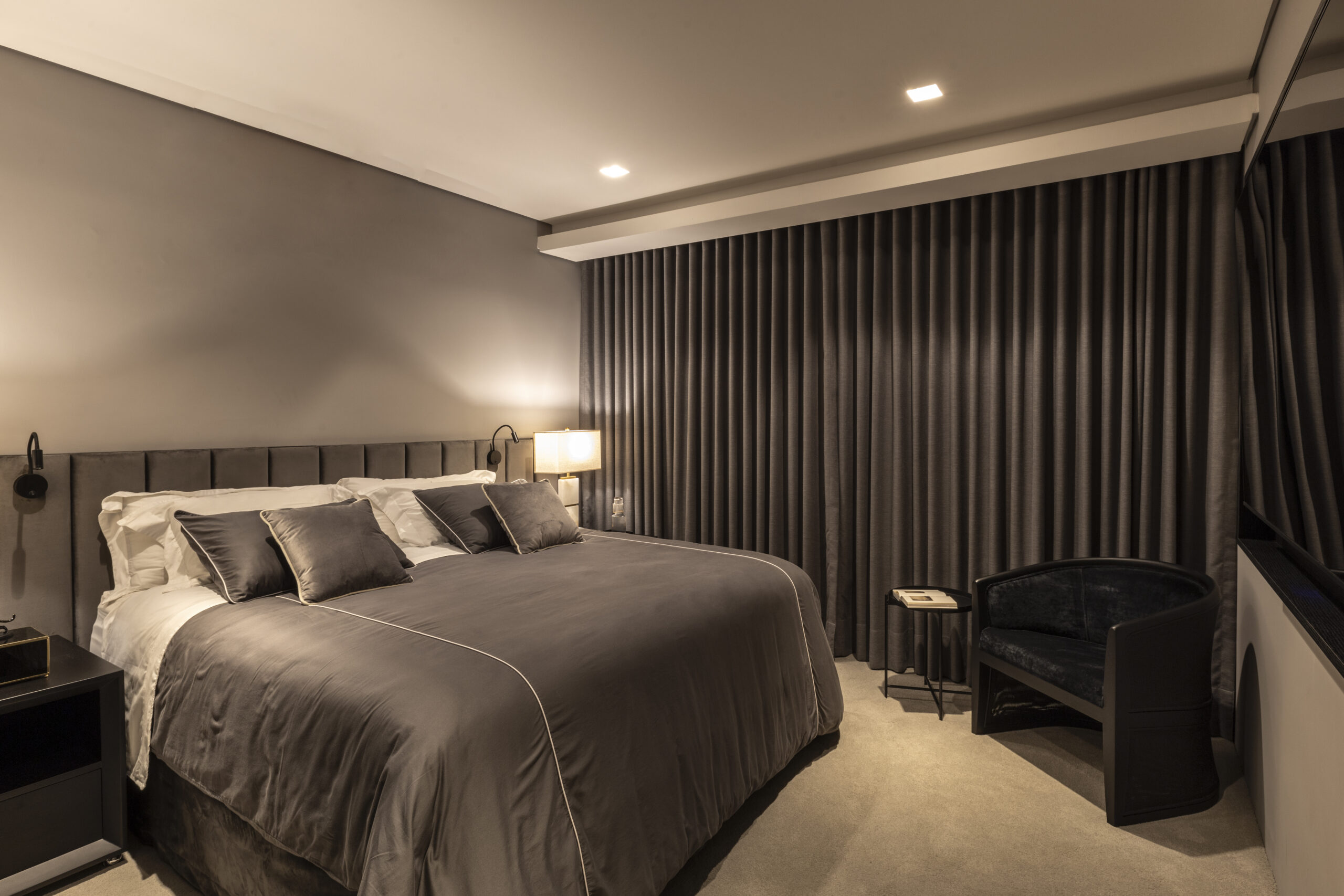 Todo o projeto nasceu da paixão do morador pelos quadros de Vito Campanella, artista italiano. A coleção de arte foi o ponto de partida para definir a paleta de cores, texturas e até o clima do apartamento de 170 m², pensado como uma moldura para valorizar cada obra. Com atmosfera masculina e sofisticada, ele também reflete o prazer de receber bem, unindo arte, personalidade e funcionalidade em cada detalhe, como o espaço de bar sob medida.